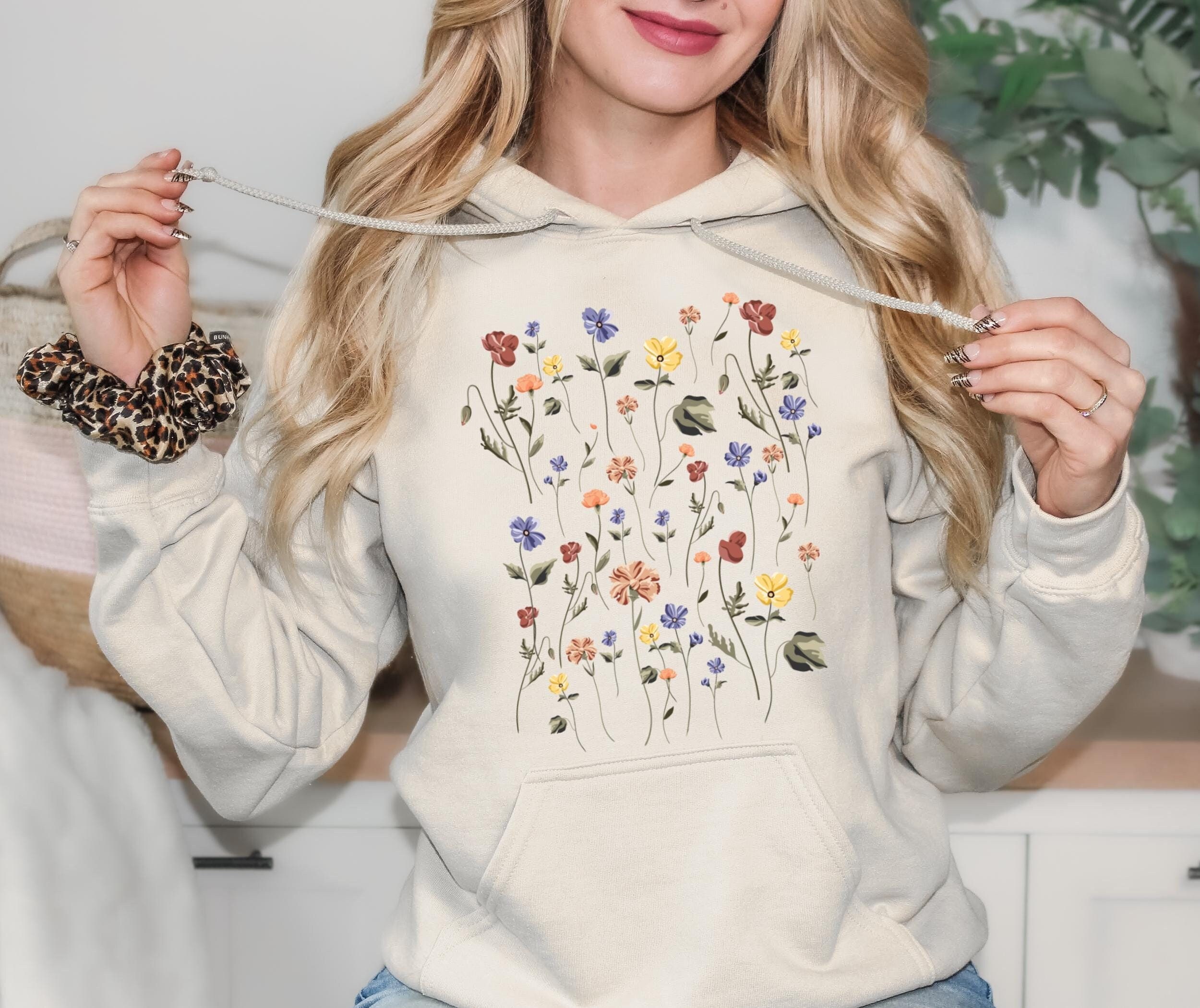 Vintage Pressed Flowers Hoodie, Boho Cottagecore Hoodie, Botanical Floral Hoodie, Wildflowers Hoodie, Gift For Gardener